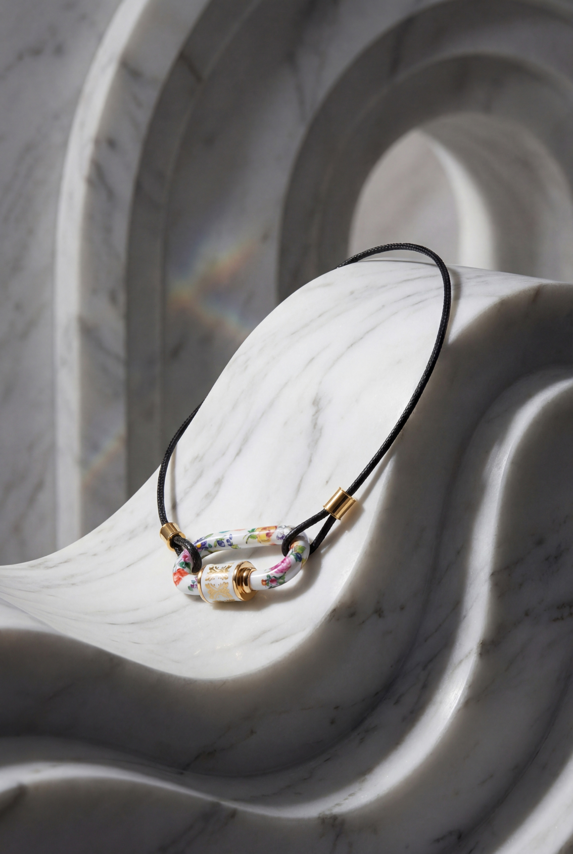 Marla Aaron x Nymphenburg; Lock & Cord | 18k Gold | Cumberland Zwei Traditionen. Eine Sprache. Marla Aaron hat mit ihrem Signature Lock das Konzept von Schmuck neu gedacht: funktional, eigenständig, ikonisch. Die Porzellan Manufaktur Nymphenburg steht seit über 270 Jahren für das feinste Handwerk Europas, handgefertigt in München. Diese Zusammenarbeit ist die logische Konsequenz zweier Haltungen, die sich in einem Punkt treffen: Kompromisse kommen nicht in Frage. Das Lock in 18 Karat Gold trägt das Cumberland Dekor — feine Blüten, Schmetterlinge und Beerenmotive, von Hand auf Nymphenburger Porzellan gesetzt. Die hexagonale Hülse verbindet New Yorker Precision Engineering mit Münchner Malerhandwerk. Jedes Stück entsteht einzeln. Nicht als Versprechen, sondern als Tatsache.