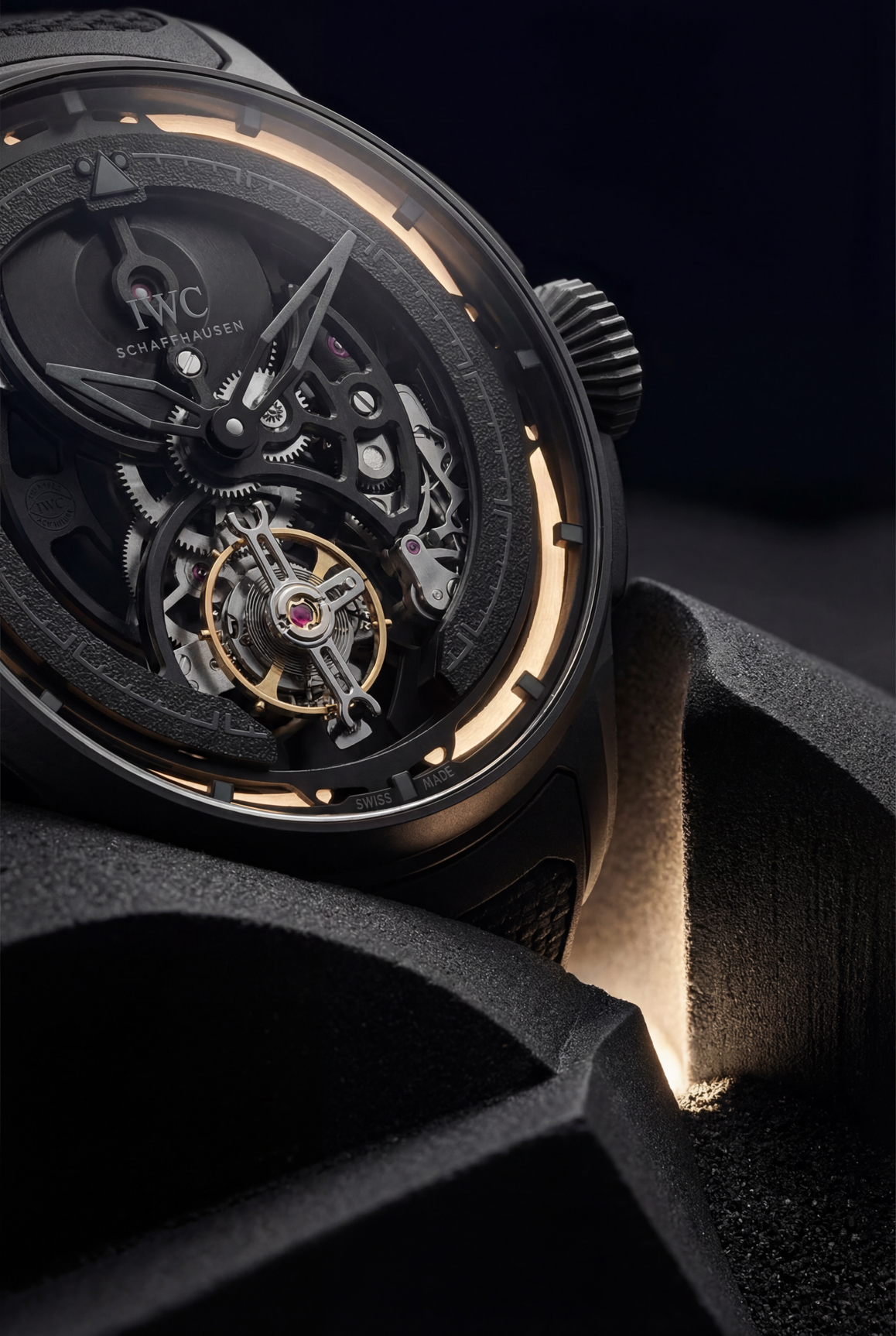 Das Tourbillon gilt als die sensibelste Komplikation der Uhrmacherei. Jahrzehnte lang war es genau das: empfindlich, kostbar, schützenswert. IWC hat das geändert. Mit dem patentierten SPRIN-g PROTECT® System wird das Tourbillon erstmals aktiv gegen Stöße geschützt — eine Blattfeder aus Bulk Metallic Glass suspendiert das gesamte Werk im Gehäuse und absorbiert Aufprallkräfte, bevor sie das Innenleben erreichen. Das Ergebnis überlebt Beschleunigungen von über 10.000 G. Monochrome Watches Eine Zahl, die keine Erklärung braucht. Das Werk ist skeletonisiert — Platinen, Brücken und Rotor auf das Wesentliche reduziert. Nicht aus ästhetischen Gründen, sondern um Masse zu minimieren und das Schockabsorber-System auf maximale Leistung zu bringen. Das Tourbillon, 56 Teile, 0,663 Gramm, sitzt bei sechs Uhr. Sichtbar. Ungeschützt wirkend. Und trotzdem unzerstörbar. Gehäuse und Krone aus Ceratanium — IWCs eigenem Material, das die Leichtigkeit von Titan mit der Härte von Keramik verbindet. The Watch Pages Limitiert auf 100 Stück. Time and Tide Watches Manche Uhren zeigen, wie weit Handwerk gehen kann. Diese zeigt, wie weit Ingenieurkunst denken kann.